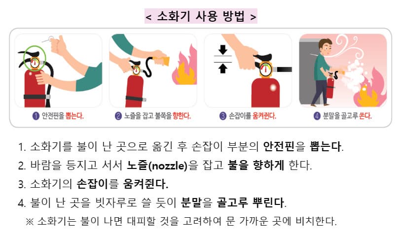 🔹 소화기는 정기적으로 점검하고, 압력 게이지를 확인하세요.